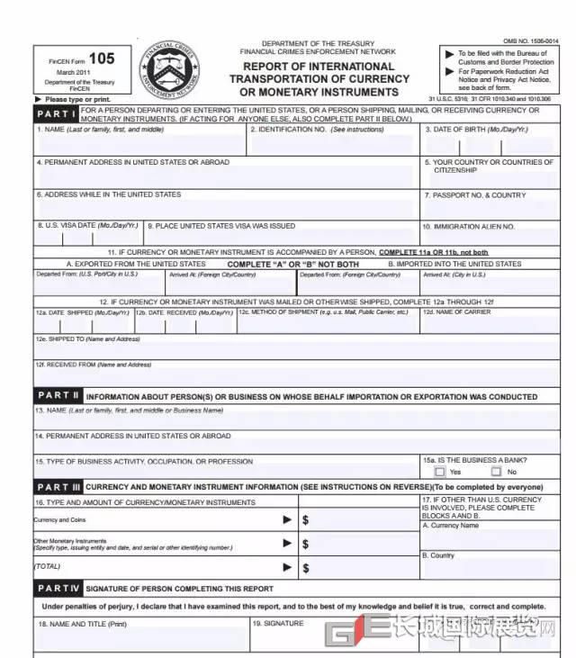 • 個人入境:攜帶現金/支票超過1萬美元 需要申報,并填寫FinCEN 105表格
